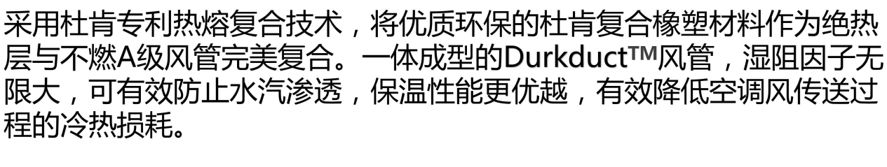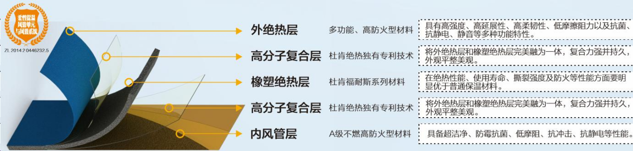 杜肯風(fēng)管系統(tǒng)的材質(zhì):Durkduct TM 風(fēng)管材質(zhì)是一種運用獨有的高分子專利融合技術(shù),將功能外絕熱層、橡塑絕熱層和A級不燃內(nèi)風(fēng)管層完美融為一體的橡塑復(fù)合材料。