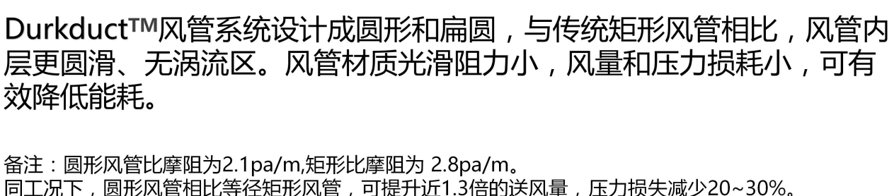 不同于矩形鐵皮風(fēng)管的易剪切壓力變形,Durkflex TM 風(fēng)管系統(tǒng)采用圓形、扁圓形狀,將內(nèi)部壓力合理轉(zhuǎn)化成管壁橫向拉伸力,可承受3000Pa-5000Pa以上壓力,遠(yuǎn)高于傳統(tǒng)風(fēng)管2000Pa以下的適用范圍。